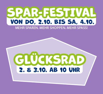 Zur Feier unseres großen Spar-Festivals laden wir dich am Donnerstag, 2.10. (im EG nähe Steinvisionen) und auch am Freitag, 3.10. (im EG bei der Hauptbühne) jeweils ab 10 Uhr ein, dein Glück am Glücksrad zu versuchen – mit tollen Sofortgewinnen und angesagten DJ-Beats!