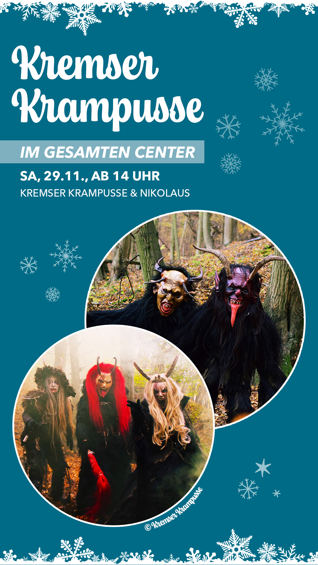 Am Samstag, den 29. November ab 14 Uhr ziehen die Kremser Krampusse gemeinsam mit dem Nikolaus durchs Center und sorgen für ein beeindruckendes Schauspiel aus eindrucksvollen Masken, detailreichen Kostümen und strahlenden Gesichtern.