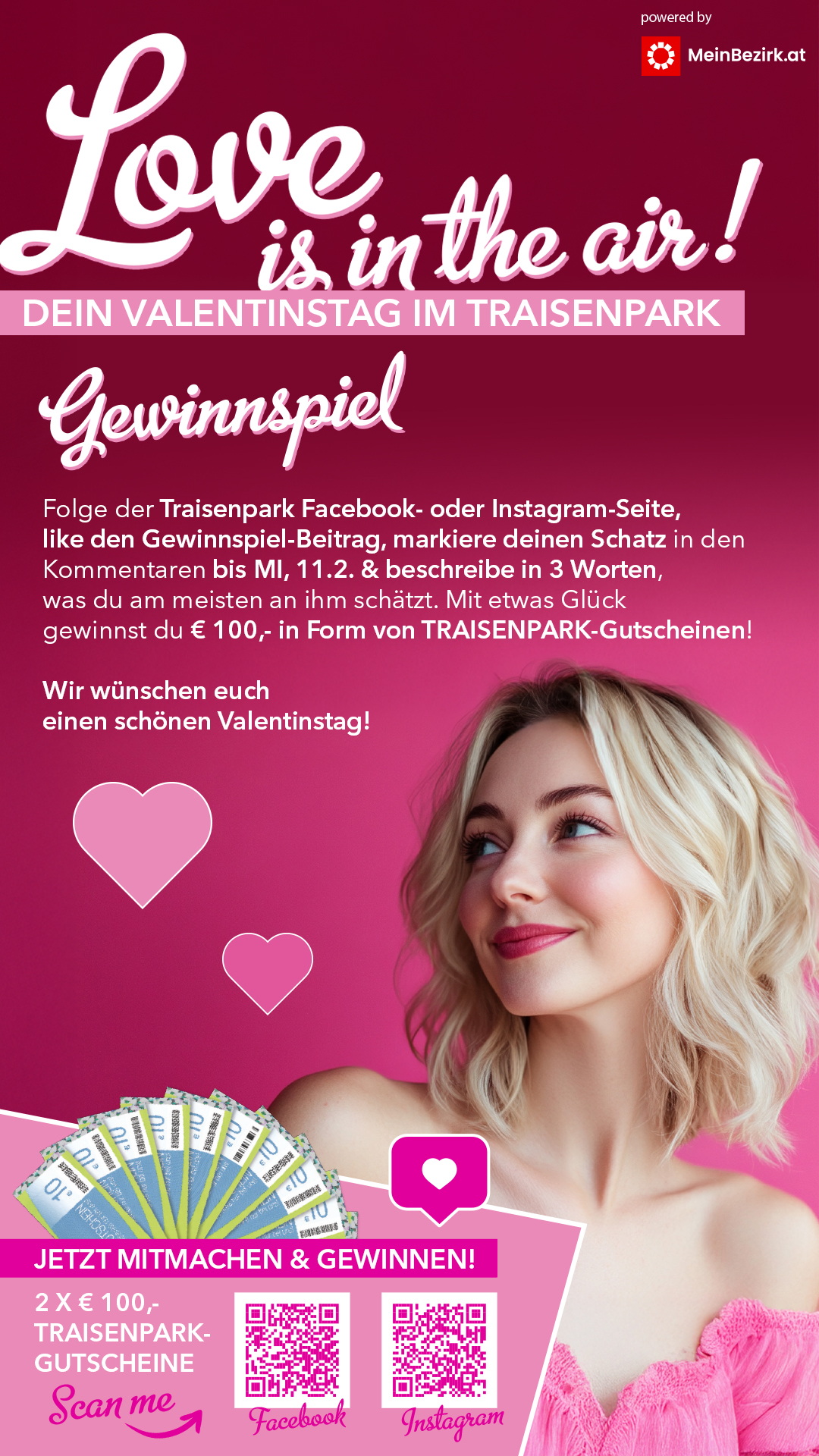 Mit etwas Glück gewinnst du € 100,- in Form von TRAISENPARK-Gutscheinen – perfekt für gemeinsame Shopping-Momente & kleine Valentinstagsfreuden.