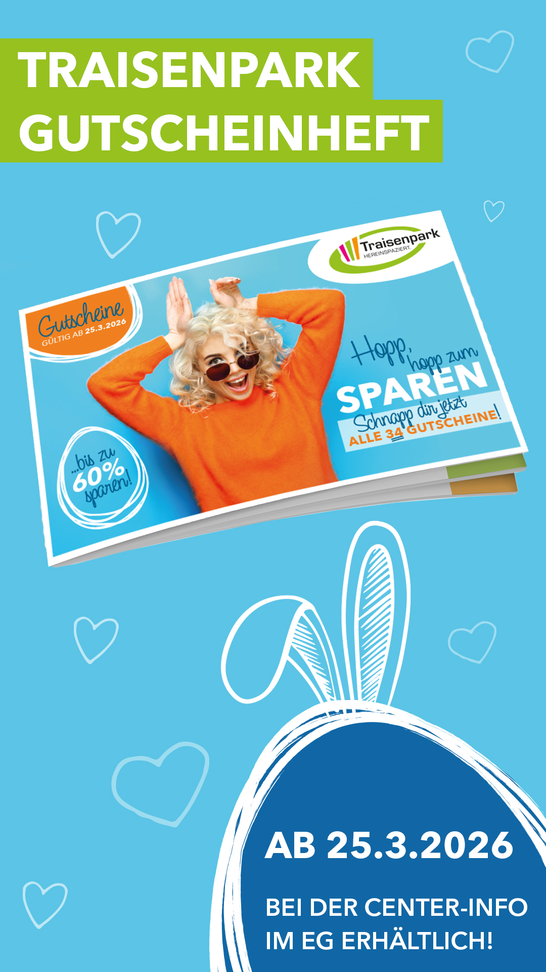 Sichere dir ab 25.3.2026 bei unserer Center-Info im Erdgeschoss das brandneue Traisenpark Gutscheinheft mit 34 tollen Gutscheinen zum shoppen und sparen!